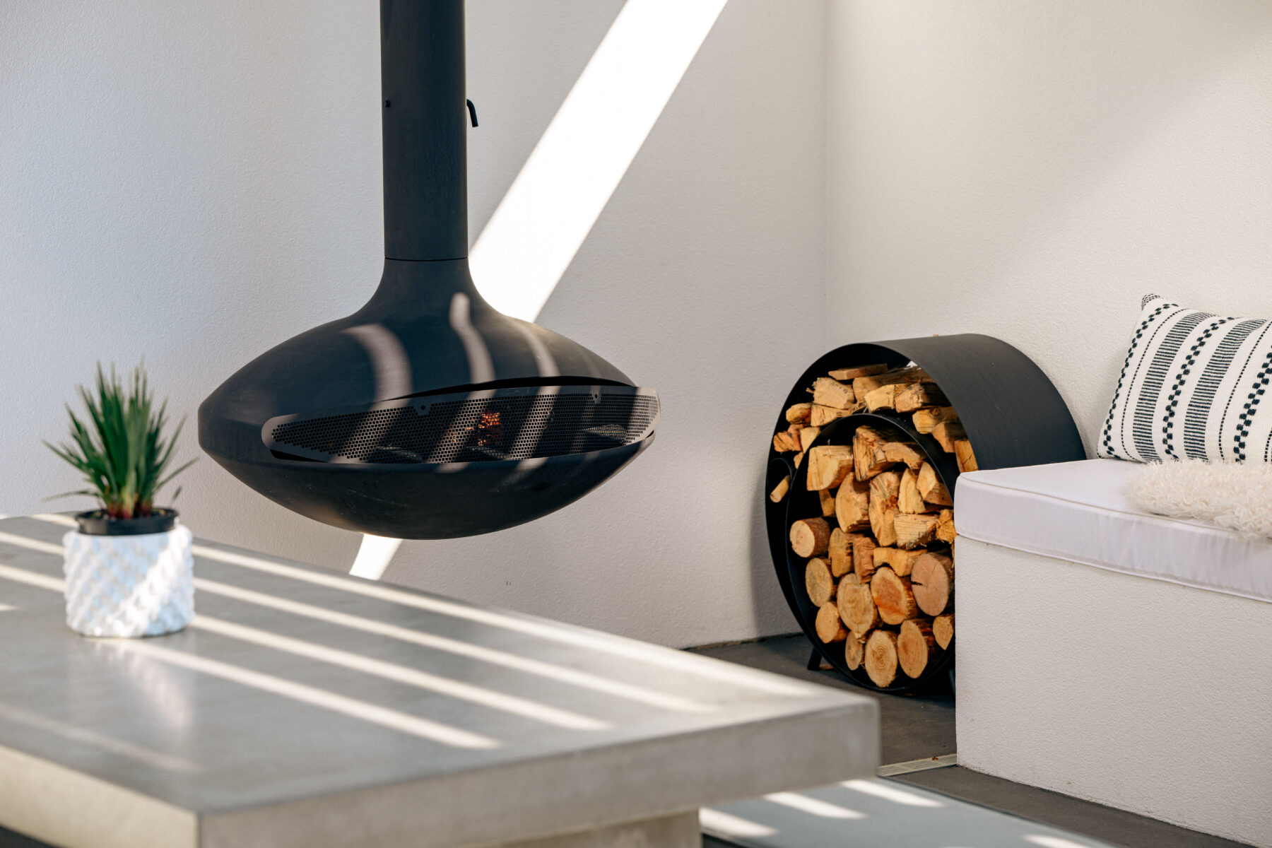 Structural masonry walls and a steel pergola create a sheltered, all-weather area, complemented by custom outdoor kitchen cabinetry with hardwood cladding and weatherproof detailing. A client-supplied hanging fireplace provides a warm focal point, while the surrounding lawn was reinstated to complete the cohesive, inviting environment.